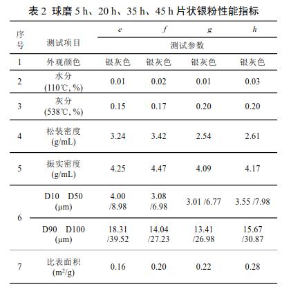 由表1結合圖1可知,反應時間2min、4min制備得到的原始銀粉主要以團聚體形式存在,而反應時間6min、8min則主要以花簇狀團聚形式存在。同時可以看出反應4min制得的原始銀粉其粒徑大小、振實密度適中;2min制得的原始銀粉振實密度小,比表面積大,吸油量大,不適用于高振實高銀含量的導電膠體系;反應6min和8min制得的原始銀粉,其粒徑大,球磨制得的片狀銀粉粒徑在10μm以上,雖然其均表現(xiàn)出較高振實密度,但是其在連續(xù)點膠或絲網(wǎng)印刷等施膠過程中會存在堵孔或網(wǎng)的問題,影響連續(xù)施膠。因而,我們選用反應4min制得的原始銀粉進行后續(xù)球磨實驗。表1反應2min、4min、6min、8min原始銀粉性能指標