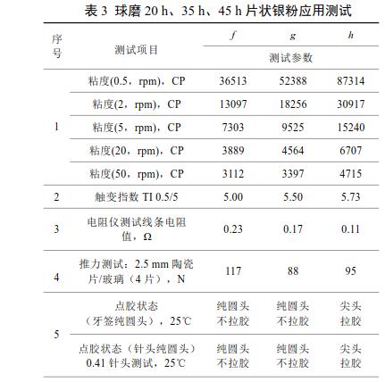 由表3可知,球磨20h、35h片狀銀粉制得IC封裝導電銀膠點膠效果好,無明顯拉膠現(xiàn)象;45h的制得導電銀漿點膠存在尖頭和拉膠現(xiàn)象。同時可以看出,20h的片狀銀粉觸變指數(shù)低,導電銀膠需要有良好觸變特性便于點膠;45h的片狀銀粉觸變指數(shù)高;而且可以看出35h、45h制得的導電膠的線條電阻值較小。這三款產(chǎn)品推力測試、固化后硬度測試、高低溫冷熱沖擊測試及高溫高濕測試均滿足應用。綜合上述各項指標,球磨35h制得的片狀銀粉制得的導電銀膠均達到了應用指標要求。